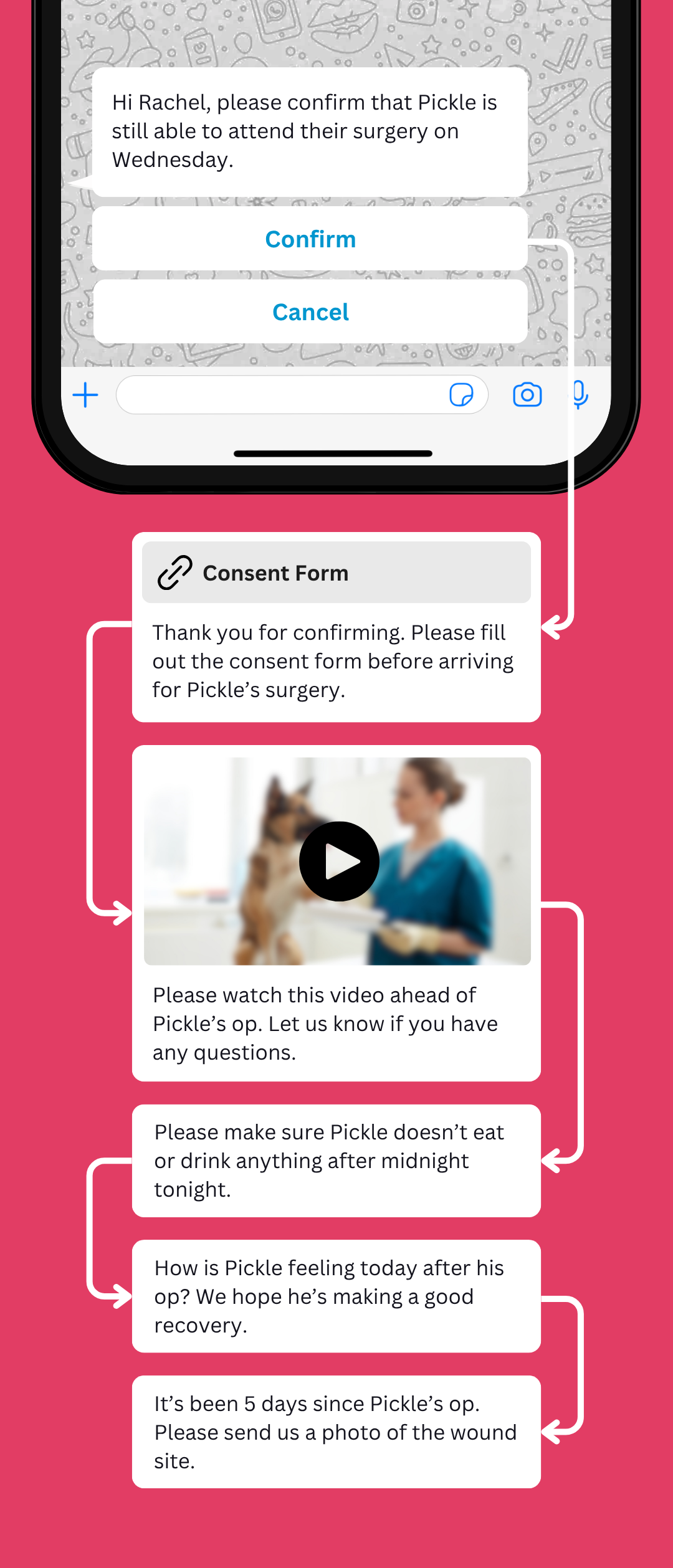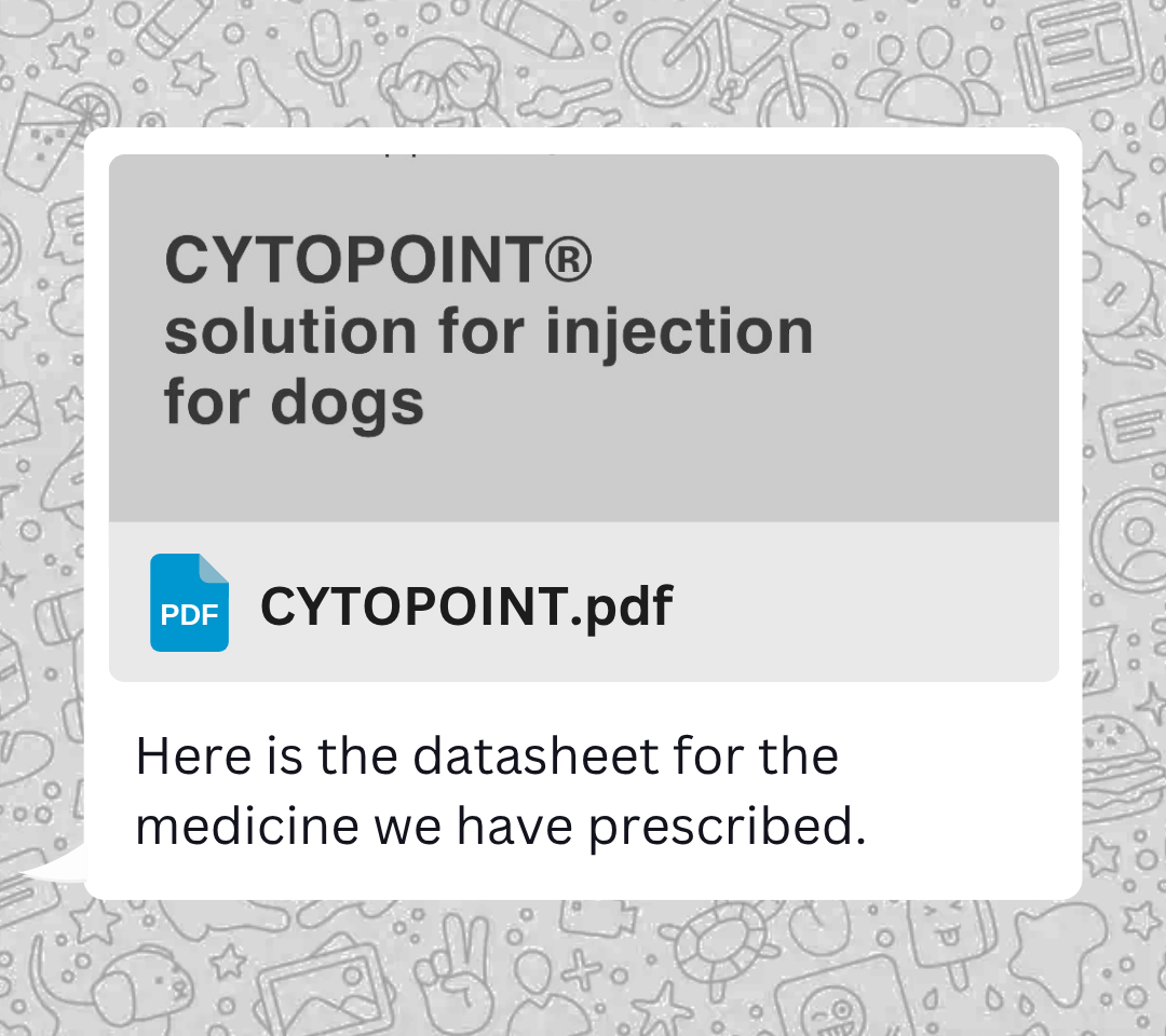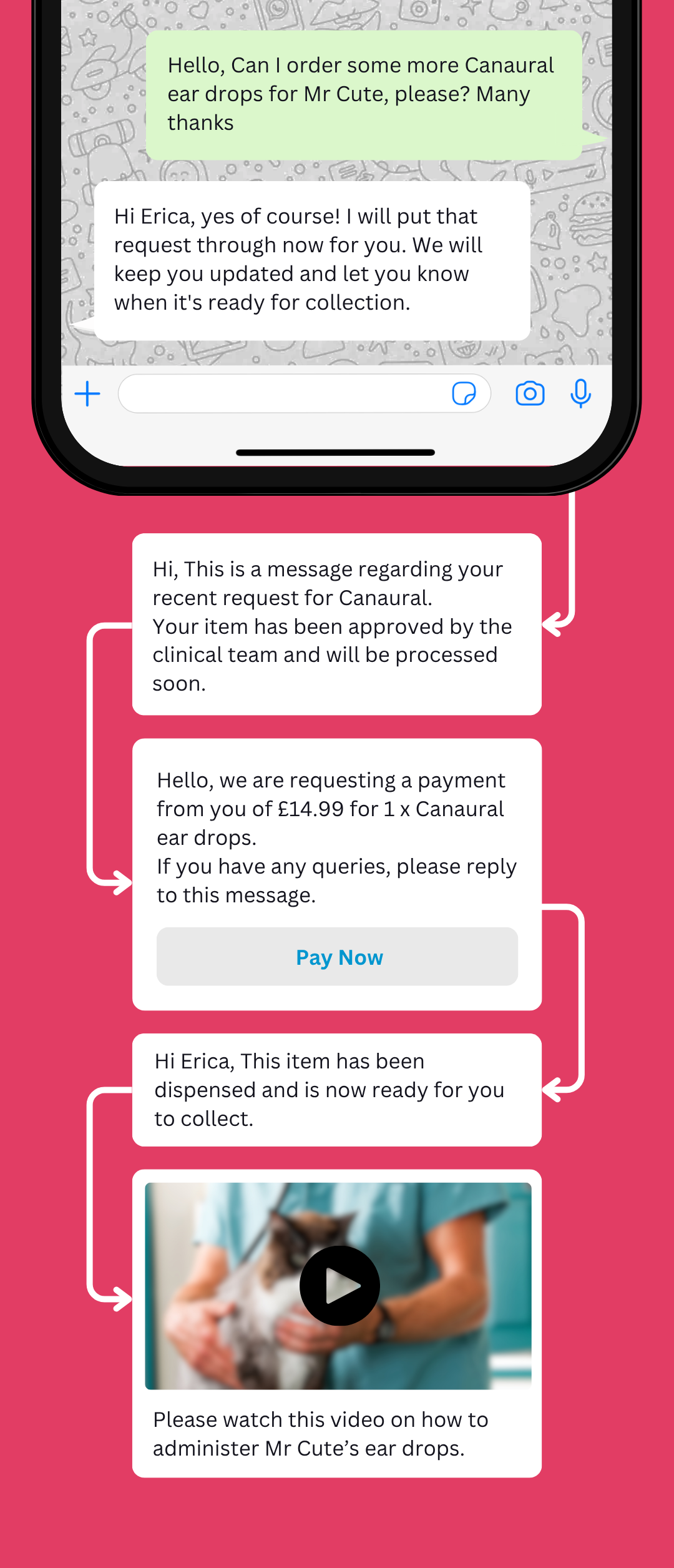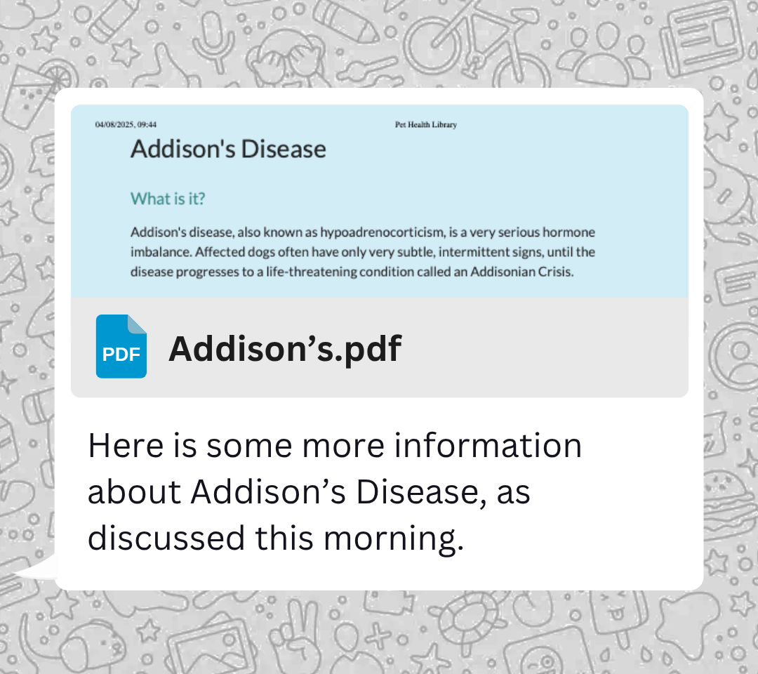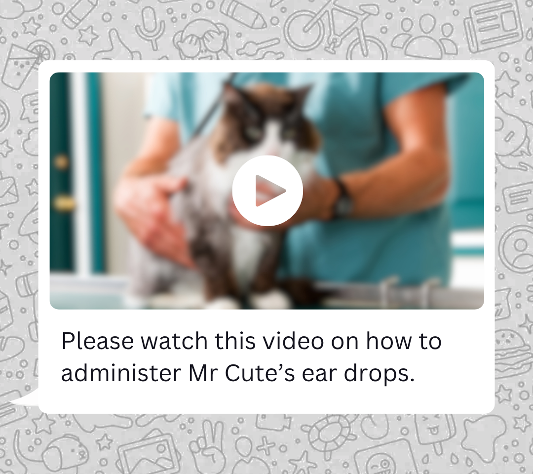 Easily send follow-up messages after consults or medication is dispensed. Share how-to videos, datasheets or pet health info (use ours, written by vets, or supply your own) automatically. It builds client trust, improves compliance, and saves your team time.